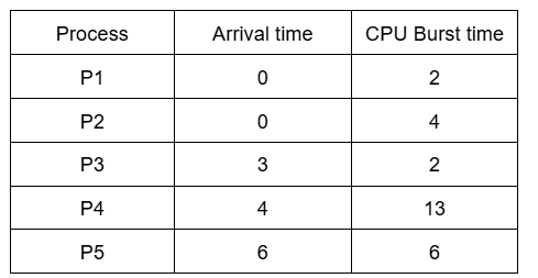 Consider the following five processes, with their arrival times and execution times given in milliseconds.