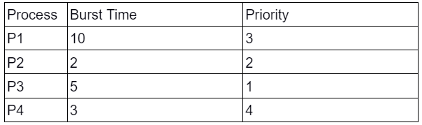 Consider the following processes arrive at time 0 in that order ( process 1,2,3,4) with given information. The priority (lowest number is treated as high priority) is used only for Priority scheduling algorithm or as tie breaker