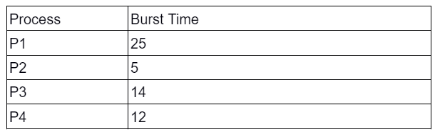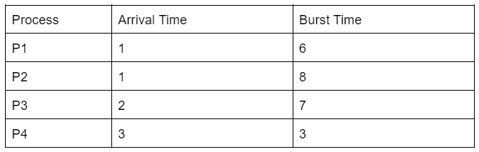 Consider the following processes arrive at time 0 in that order ( process 1,2,3,4) with given information.